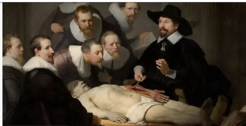 Неговото тело е како вајан сив мермер, секој мускул е беспрекорно засенчен. Но, осветлената фигура во „Час по анатомија на доктор Николас Талпа“ (1632) од Рембрант не е херој на грчката антика.